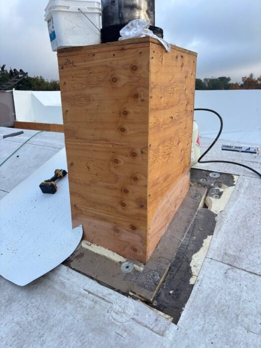 flat roof repair. It offers excellent resistance to UV radiation, mechanical stress, and temperature fluctuations. The use of TPO allowed us to not only seal the area around the chimney but also create a seamless, uniform surface without transitions between different materials.
